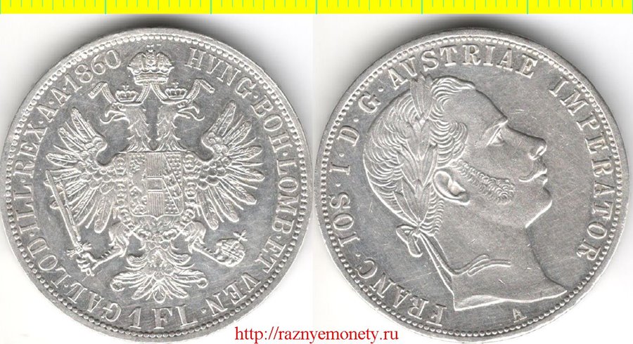 Австрия 1 флорин 1860 год А (тип 1857-1865, серебро 12 г) Франц Иосиф I