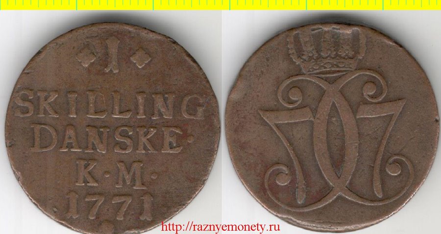Дания 1 скиллинг 1771 год (год-тип, медь) Кристиан VII