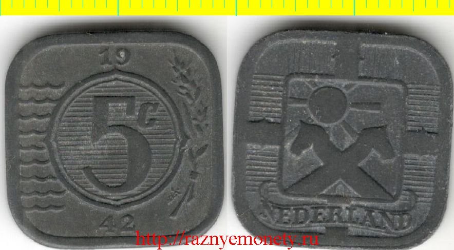 Нидерланды 5 центов 1942 год (тип 1941 - 1943, цинк) Вильгельмина I