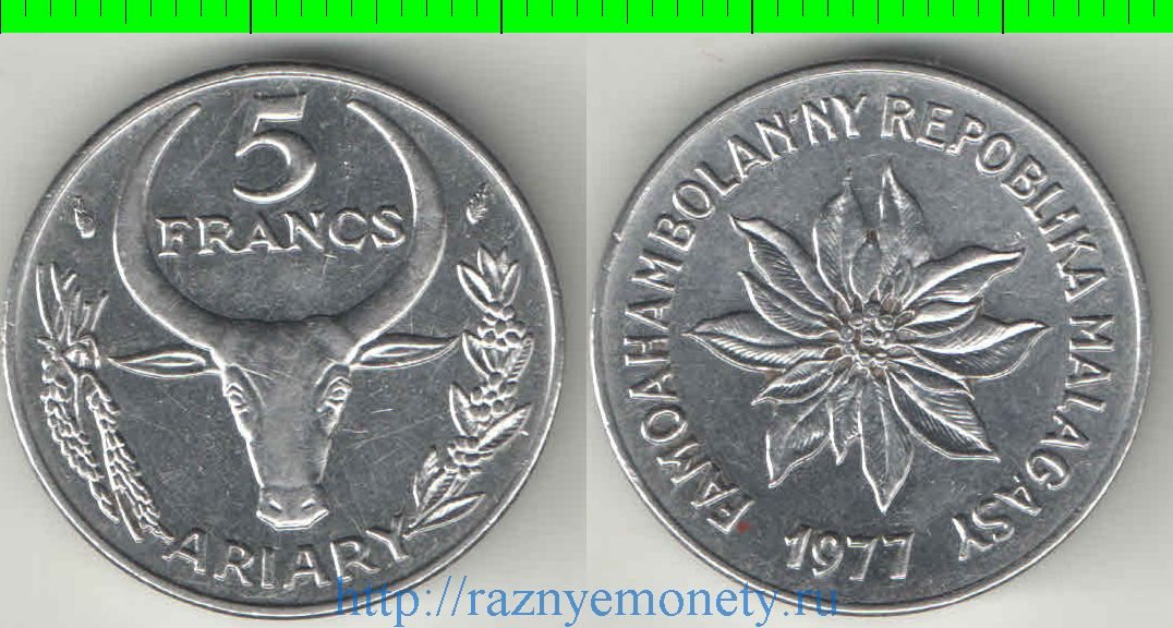 Мадагаскар 5 франков (1966-1989) (тип I) (нержавеющая сталь) (животные, буйвол, растение, цветок)