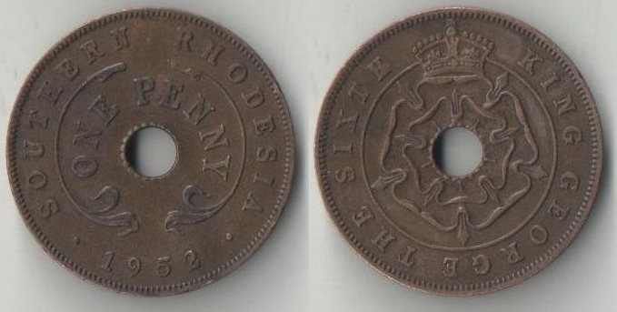 Родезия Южная 1 пенни 1952 год (Георг VI не император) (неправильная форма, отверстие)