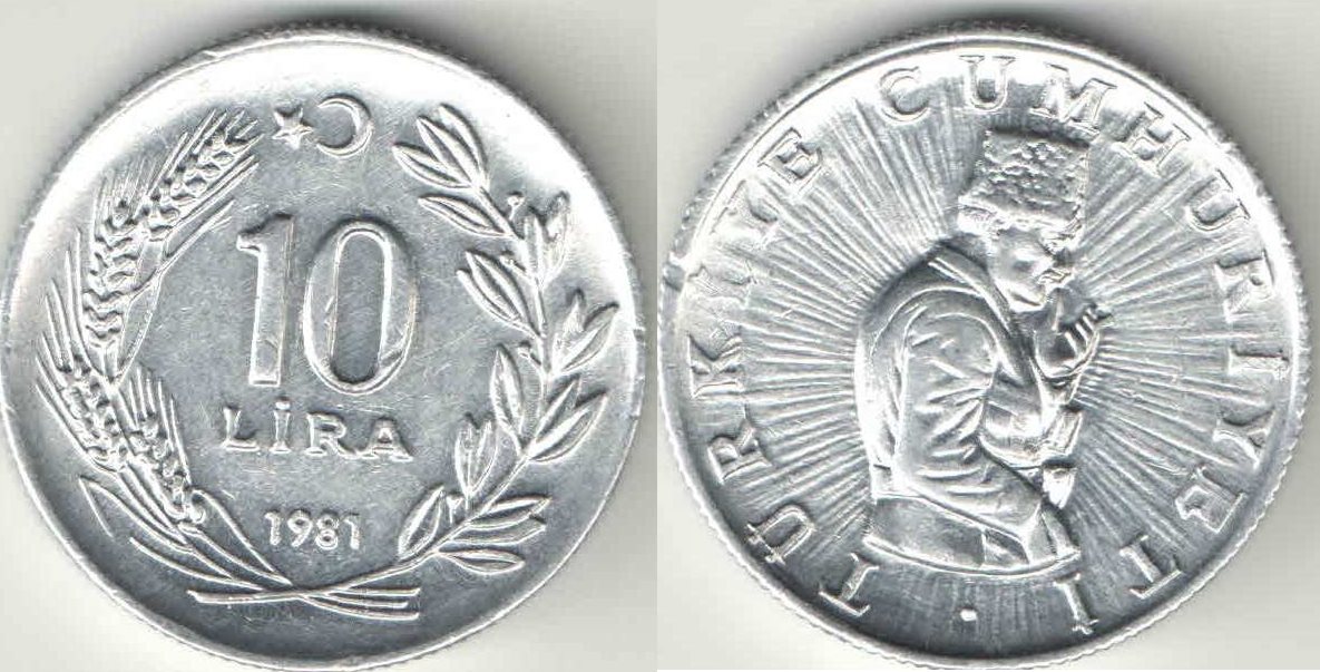 Турция 10 лир 1981 год (тип I, нечастый тип) (ранняя луна)