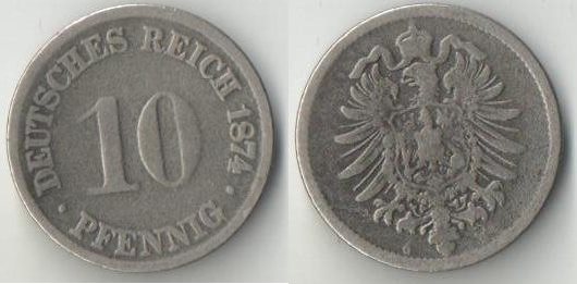 Германия (Империя) 10 пфеннигов 1874 год G (нечастая)