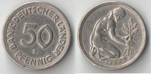 Германия (ФРГ) 50 пфеннигов 1949 год D, F, G, J ( (тип I, нечастый тип) (гурт рубчатый)