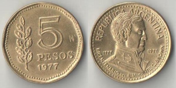 Аргентина 5 песо 1977 год (адмирал Браун) (нечастый тип)