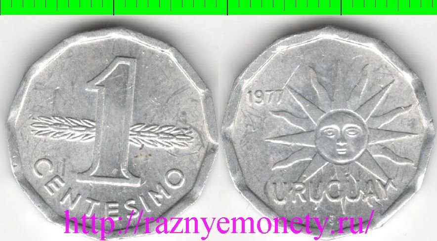 Уругвай 1 сентесимо 1977 год (редкий тип и номинал) (неправильная форма, многоугольник)