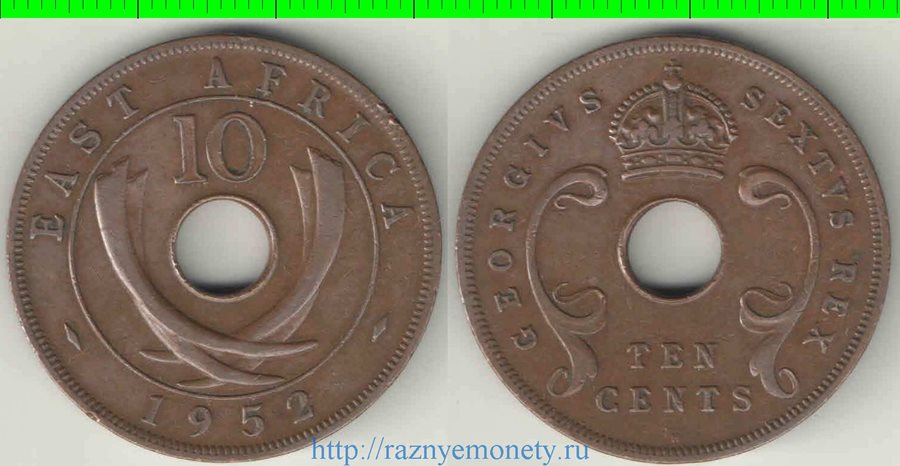 Восточная Африка 10 центов (1950-1952) (Георг VI, не император) (неправильная форма, отверстие)