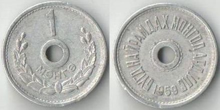 Монголия 1 менге 1959 год (неправильная форма, отверстие)